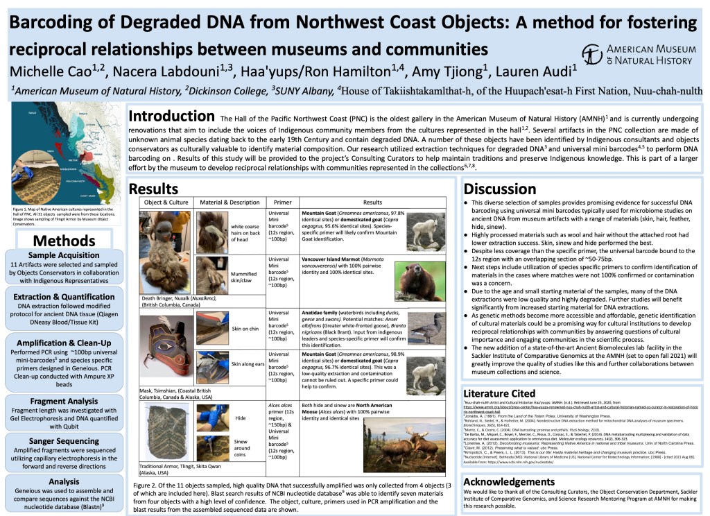 One SRMP project, entitled, DNA Barcoding of Northwest Coast Objects: A method for fostering reciprocal relationships between museums and communities, was in collaboration with the restoration of the Northwest Coast Hall. The goal of this restoration is to improve the representation and inclusivity of the exhibited cultures through collaboration with First Nation leaders and Native scholars.
